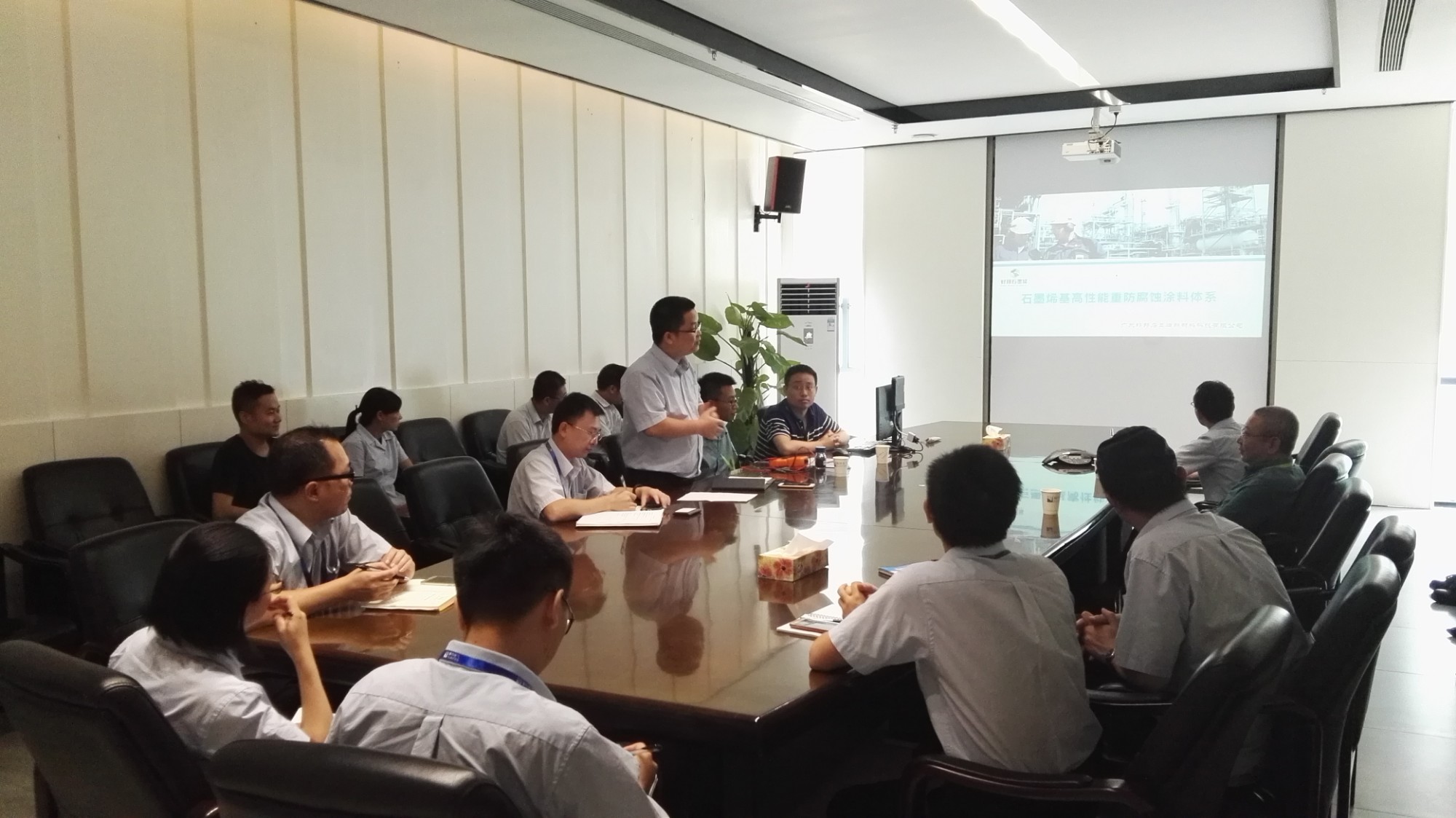 ? ? 2018年8月1日,廣東好邦石墨烯新材料科技有限公司董事長韓強、總經(jīng)理姚永健攜技術(shù)人員前往順特電氣有限公司就石墨烯防腐涂料進行了第三次技術(shù)交流,順特公司供管部、設(shè)計部、技術(shù)部、工藝部、檢驗部等部門領(lǐng)導(dǎo)參與了交流會。會議主要討論了石墨烯涂料在電氣設(shè)備上應(yīng)用的可行性及優(yōu)越性,之前順特電氣已對好邦公司的石墨烯涂料進行了一年多的相關(guān)試驗測試,驗證了石墨烯涂層配套性能明顯優(yōu)于傳統(tǒng)
